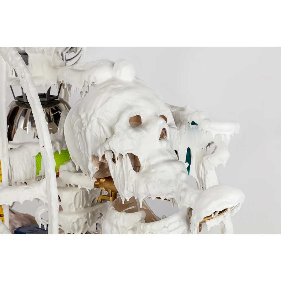 "白色釋出"是金氏自職業生涯初期就開始創作的主要系列之一。他將各種物品堆放一起,然後澆上白色樹脂。在這件作品中,他將雕像、管道、各種容器和日用品等物品隨意堆放在椅腳上,塑造成一個堡壘或塔樓的形狀。雖然金氏是一位雕塑家,但他並不雕刻石頭和木頭等材料,而是展示將日用品、工業產品和玩具等現有物品轉化爲雕塑的構造。由於這些部件都是現有物品,它們各有特定的功能、用途和含義,這些屬性本應賦予它們存在的意義。然而,在這件作品中,金氏有意忽略了這些既有屬性,將通常不會擺放一起的物品聯繫起來。此外,白色液體甚至掩蓋了它們原有的形狀。正如大雪把街道、橋樑和房屋覆蓋成純白色,模糊了它們的輪廓和邊界一樣,在金氏的《白色釋出》中,固有的意義和形象也在白色中化爲烏有。從詞源學上,"釋出(discharge)" 指的是釋放(dis-)充滿(charge)的東西。在金氏構建難以辨認的構造物中,飽和的屬性以白色液體的形態溢出。當一切混雜在一起,並似乎要抹去所有的時候,仍有一些物品保持原狀,從間隙中窺視觀眾。當那些在日常生活中被忽視、被遺棄、不被認可的事物即將消失時,它們反而更加耀眼奪目。