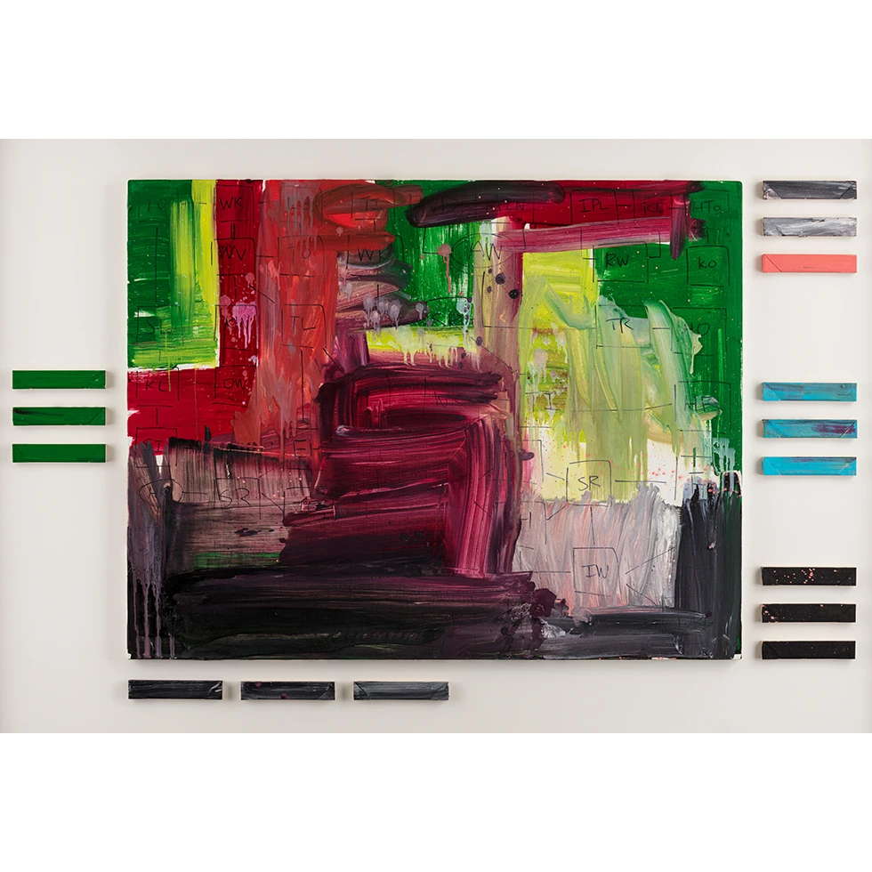 南の作品は、独自の「アルゴリズム」によって構成されている。南が作品を描く際、当然のことながらさまざまな事象が自身の内外を取り巻いている。鑑賞者にその意味が明かされることはないが、本作で言えば画面内に書き込まれている記号や図式のようなもの、それらが「アルゴリズム」そのものである。タイトルは本作の「アルゴリズム」を文字列として表したものということになろう。作家が何かをイメージする時、そのイメージは脳内においてどのように作り出されるものだろうか。現実のものを目で見て、それをその通りに描くとするにしても、何かしらの変換や構築を経ることなく現実空間のものは二次元的な表現へ写しとることは不可能である。南が言う、絵画を「アルゴリズム」で表現するという意味は、まさにその画家の内面で起きているイメージを絵画として変容させていく現象それ自体を描出しようと言うに等しいことである。本作の構成要素に額装用の規格材が着色されて配されている。キャンバスの図式、色面構成、それらと対応しているようにも感じられる。本作を真に理解するということは「アルゴリズム」の実行者である南のクリエイティビティの根源を理解することに他ならない。そのようなことが一体可能なのだろうか?ひいては、わたしたちを取り巻くあらゆる事象について、隣にいる友人や家族について、果たして真に理解し得ることなどあるだろうか?
