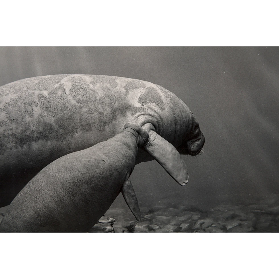 杉本の作品の中でも初期の重要な作品の一つに、NYのアメリカ自然史博物館の展示物をあたかも実際の風景の様に写したことで始まった「ジオラマ」シリーズがある。本作はその一つで、デンバー自然科学博物館のマナティの親子の標本展示を撮影したものだろう。ジオラマ自体の完成度もあってのことではあるものの、予備知識なく本作品を見れば海中の微笑ましいワンシーンを写真に写したものと誤認するはすである。8 x 10インチの大判フィルムならではの精密さで生々しく写し取られており、同様の「劇場」や「海景」よりもその解像度の精緻さがより強く発揮されている。非生命に生命を吹き込み直す魔術のような表現は蝋人形の「肖像写真」シリーズへも繋がっていく。「ジオラマ」はNYの伝説的ギャラリーであるソナベンドの所属作家となる契機となった他、70年代MoMA写真部門の名物キュレーターであったジョン・シャーカウスキーにも本シリーズを認められて同館のコレクションへ収蔵に至っている。写真が美術として認知されていくにあたってシャーカウスキーの業績は美術史において非常に大きいが、シャーカウスキーの厳しい眼識に優れた作品であると認めさせたことは駆け出しの杉本の写真が既に完成された美意識と技術によって美術品としての価値を備えていたことの証左である。