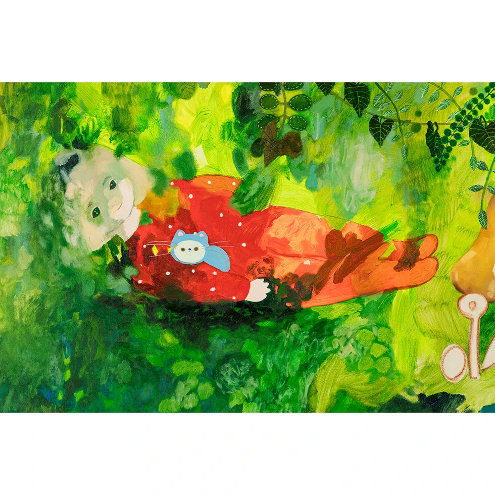 木漏れ日の明るい緑色が、対比的な赤い服を着たこどもを柔らかく包む。その傍には、ぬいぐるみのような犬が見守る。ぼんやりとした表情を浮かべながら、幼子は今にも眠りに落ちそうな心地よい微睡の時間を漂っているようだ。小脇には水色の愛らしい仔猫を抱えている。ルーブル美術館に所蔵されているカール・ラーションによる「Jeune femme allongée sur un banc」という作品(1913年)がある。タイトルの通り、若い女性が木陰のデイ・ベッドに心地良さそうに横たわる様子を描いたもので、傍には茶色い耳の長い小型犬が寄り添い、白黒の猫を腕に抱きながら、女性は穏やかな時間を過ごしている。長井がこの作品を知っているかどうかは定かではないが、幸せの構図とは案外普遍的なものがあるのかもしれない。長井らしい愛らしい世界観はそのままに、本作では長井の夢想の中へ引き込むよりも、むしろ鑑賞者の日常や記憶の中のふとした美しいひとときを呼び覚ますようだ。