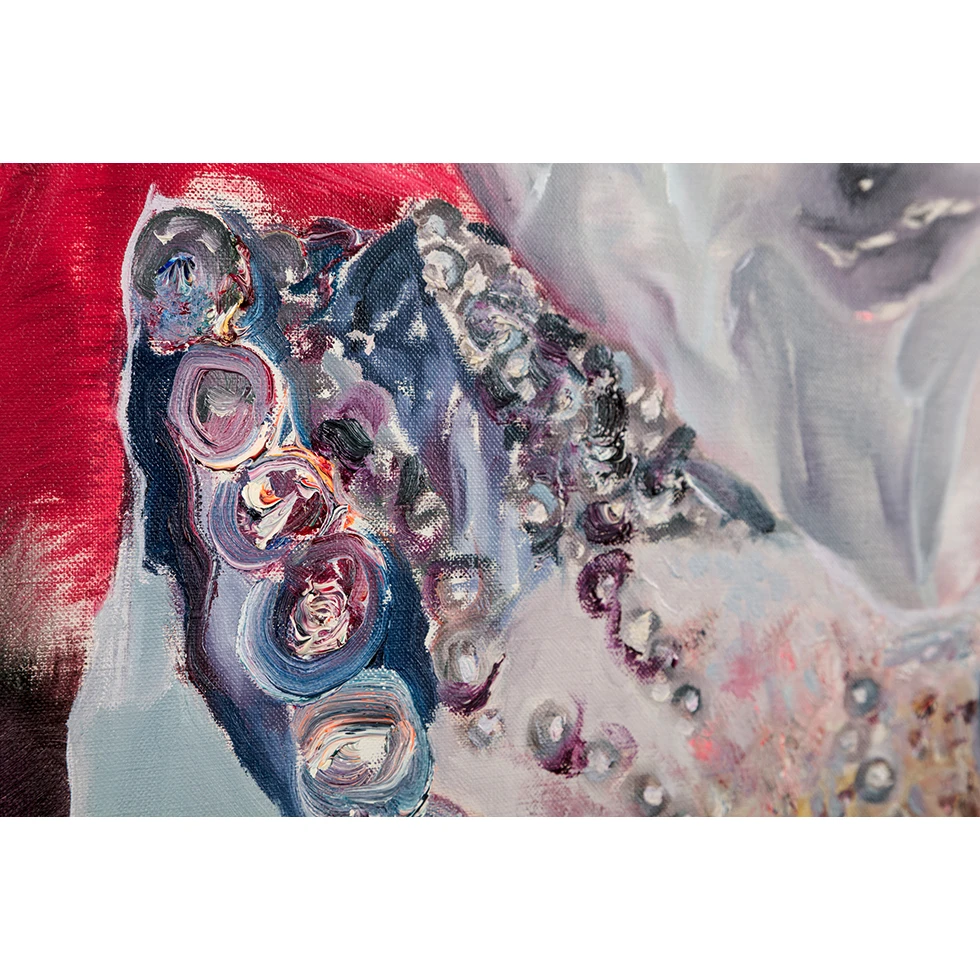松浦は自ら制作した人形やぬいぐるみをモデルにした絵画を描くことが多い。本作も、タイトルから類推される通り、手作りの人形を題材として画面に複合的な素材を用いたややコラージュ的なアプローチの作品である。明るい赤い髪が印象的だが、右目は継ぎ接ぎしたように突如として暗く鋭い視線をこちらに向けている。赤い髪と首元に掛けられたは煌びやかな宝飾によって全体的に華やかな印象であるものの、生気のない肌の色や物憂げに見える表情が一方では暗さとなって一枚の絵の中で真逆の性質が拮抗している。人らしい造形のものを命ある存在のように私たちは認識しがちだが、ここで松浦が描くものは魂のないぬいぐるみである。したがって、私たちがこの絵に人らしい表情や人体造形的な均整美を求めて鑑賞すると、恐ろしさなどの誤った感情に至ってしまう。松浦が自作するぬいぐるみや人形のように「ディフォルメ」されたものとは、本来の意味を辿れば自然的造形の模倣から離れて、歪曲され、変形された表現を指す。そこに人らしさを求めてしまう私たちの期待の眼差しにおいては、松浦がモチーフに見出した造形的な美しさが真逆に転じて見えているのである。