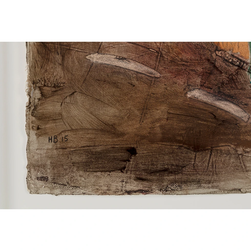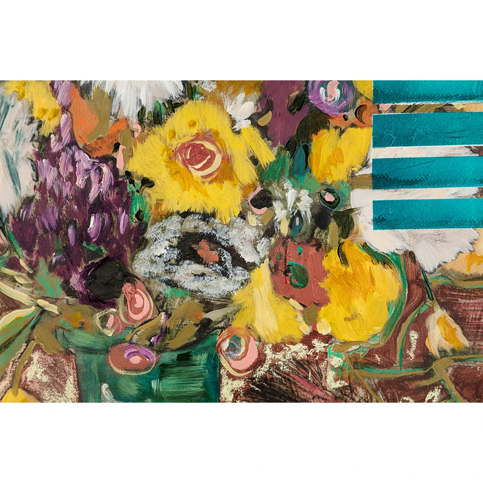 This work was exhibited as one of eight works in the series titled “Private Bouquet (Suite of 8).” It is in the style of still-life flowers, which is relatively rare for Bas, as his works often depict the human figure. The bouquet, which should surely be the principal motif of the work, is painted half-obscured behind blinds. The blue blinds are a collage of painted paper, giving a strong impression that Bas intends to hide the flowers in a more materialistic manner. However, there is a duality to the conceit of the blinds hiding the bouquet: the subject is hidden from public view, but the slits in the blinds also allow a furtive gaze from the outside. Bas uses a highly allegorical approach, never overt, to capture the human figure and portray a decadent sensuality. Viewing his work, one is intoxicated by its sweet lyricism. Bas adheres to the still life form in this piece, and yet there seems to be a hidden portrayal of sensuality within it. Given that Bas uses facial expressions and gestures to convey this sensuality when taking the human form as his subject, it is reasonable to assume that the choice of still life as a genre is deliberate. While flowers may not have facial expressions, as a painterly subject they convey a range of symbolic meanings and significances, everything from love to the body, and life and death. It can be surmised that the device of half-hiding a personified bouquet here serves as an even more powerful metaphor. The word “Private” in the title emphasizes this angle. Based on this word, the blinds compel the viewer to be aware of the relationship of their gaze. They are placed in the position of outsiders stealing a glance at this bouquet, which must be an expression of affection to a specific person in an extremely private space. Conversely, this bouquet, never fully exposed, is also a manifestation of the suppressed sensuality that is distinctive of Bas.