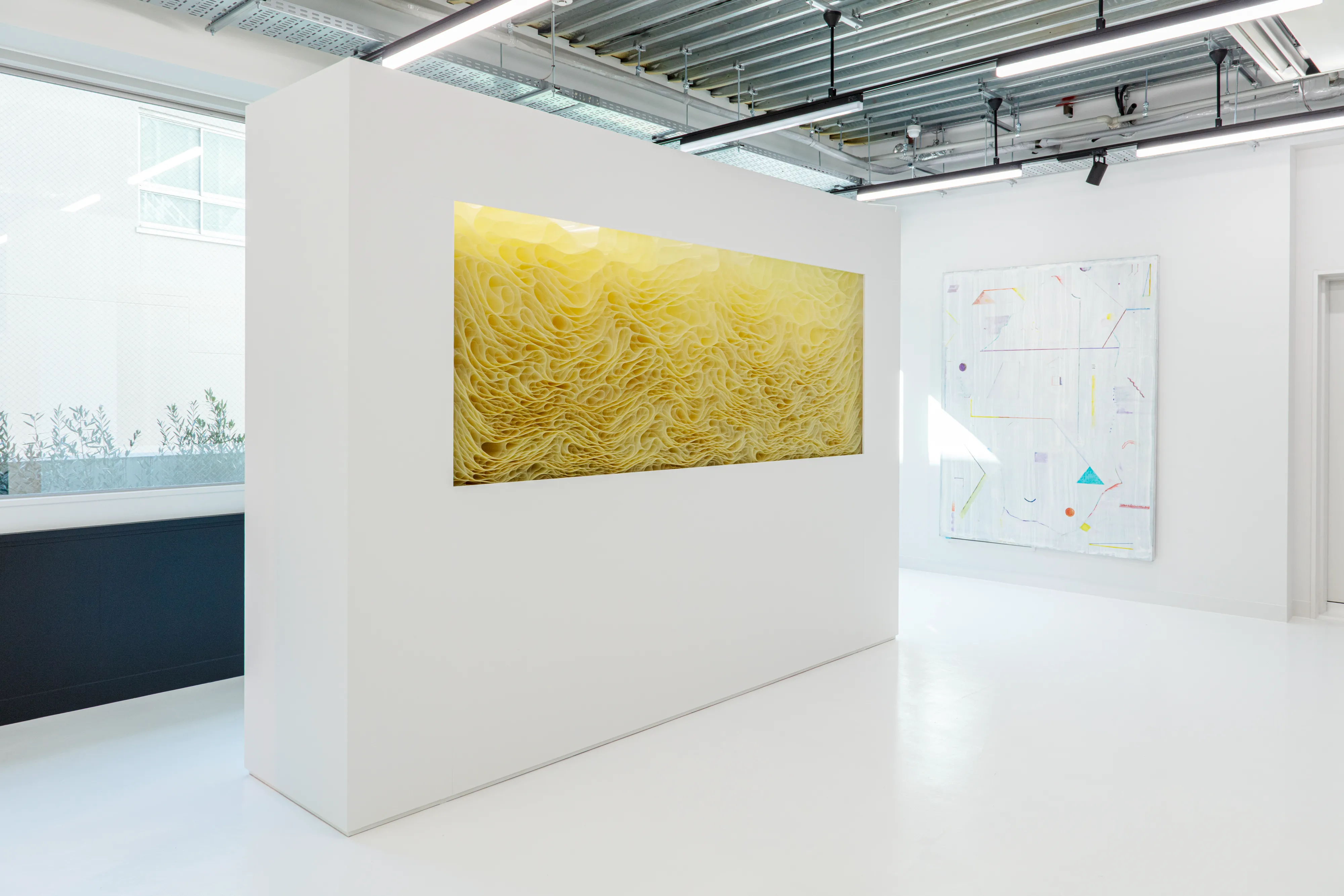 本作は、窓に面して立てられた壁の面に設けられた細長い開口部に、ポリエステル製のフィルムシートを幾層にも折り重ねて配置したインスタレーション作品です。外光がひだの内部を通り抜ける際、シートがつくる滑らかな曲面を屈折しながら鑑賞者へ届き、幻想的な光の現象が立ち上がります。